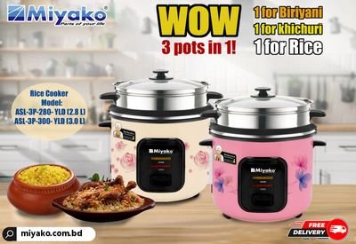 Miyako Electric Multi Curry Cooker & Rice cooker With 3 Pots 3 glass Lids- 3.5 Ltr / 1300 Watts