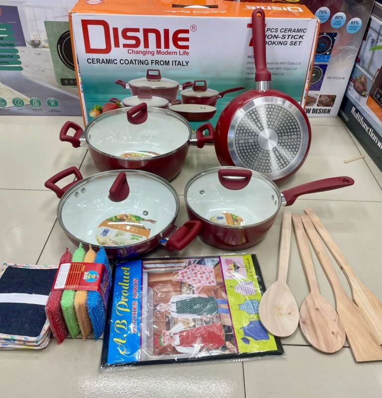 Disnie Italy Super Ceramic Induction Non Stick Cooking Set-7Pcs – Red With Gift