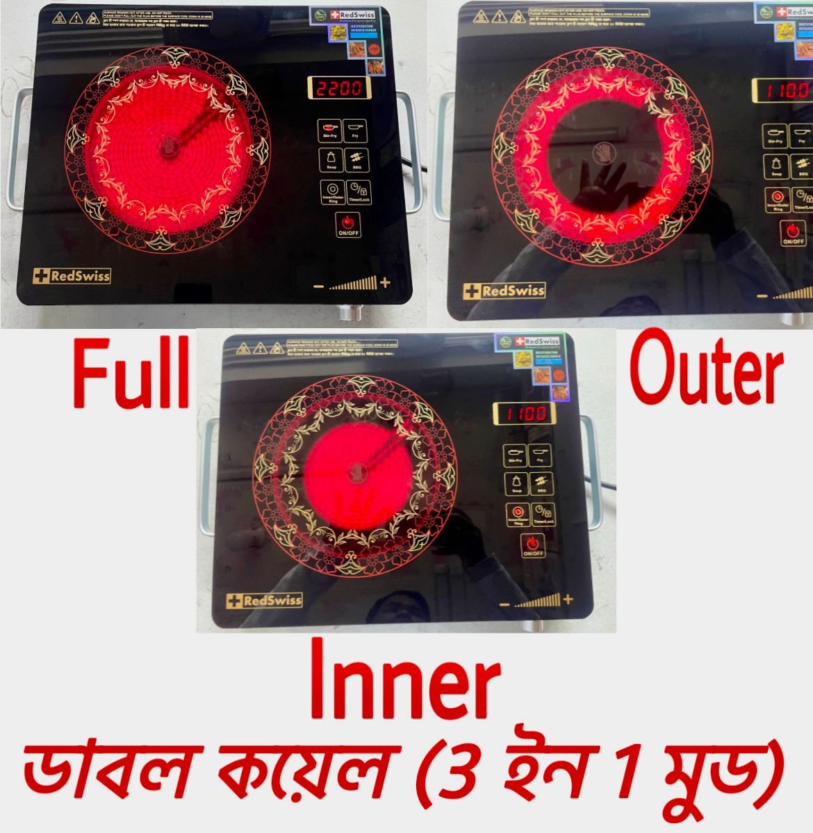 ইউরোপীয়ান কোয়ালিটির রেডসুইচ(RedSwiss) বেন্ডের ডাবল কয়েল বিশিষ্ট ইনফ্রারেড চুলা।গ্যাস-ম্যাচ ছাড়া রান্না হবে ঝামেলা বিহিন- এক চুলাতে সব ধরনের হাড়ি ব্যাবহার করা যাবে। সাথে থাকছে ধামাকা অফার মূল্য-