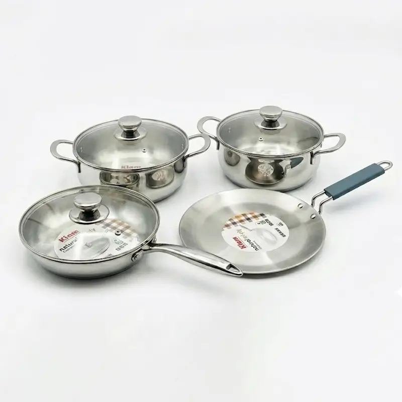This Kiam Tri-Ply Stainless Steel 7-Piece Cookware Set comes with an advanced tri-ply construction that sandwiches a conductive aluminum core between two layers of high‑grade stainless steel for quick, uniform heat distribution. It features a 26 cm Karai, a 26 cm casserole, a 26 cm Ruti tawa, and a 24 cm fry pan, each paired with a tempered glass lid that delivers easy monitoring of cooking progress.